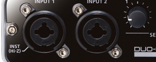 XLR端子とTSフォーン端子をそれぞれ1つずつ備えており、+48Vファンタム電源とHi-Z入力に対応しているので、コンデンサーマイクの接続やエレキギターを直接シールドで接続して録音することも当然可能となっています。